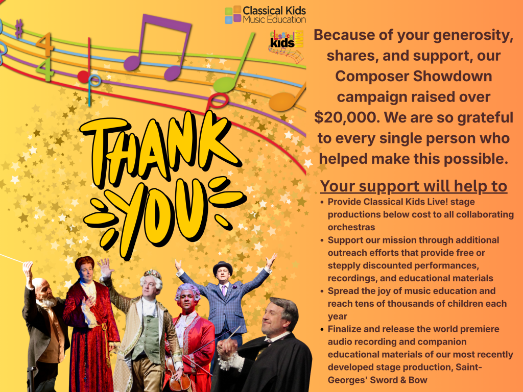 We offer sponsorship packages at the following levels, as well as customizable sponsorship packages for specific performances and/or projects. Please contact Holly Robison, Development & Communications Manager, holly@classicalkidsnfp.org for more details!
